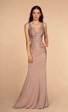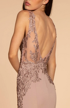 Lace Open Back Rome Jersey Long Dress Long lace dress, features illusion v-neckline, v-back with zipper, embroidery decorations and beads in a splendid pattern on the bodice and waist area and also has a mermaid silhouette. This dress is a perfect choice for formal events as a pageant dress or prom dress, or as a red carpet dress. Available in burgundy, navy and mauve