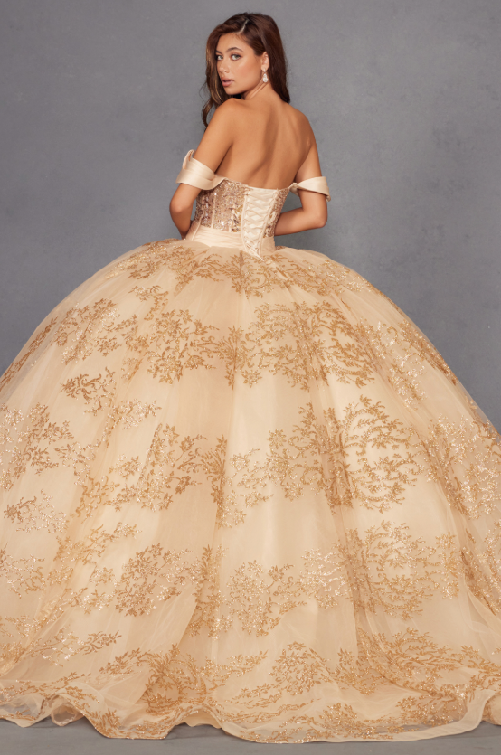 Off-Shoulder Gown With Crossover Glitter Skirt